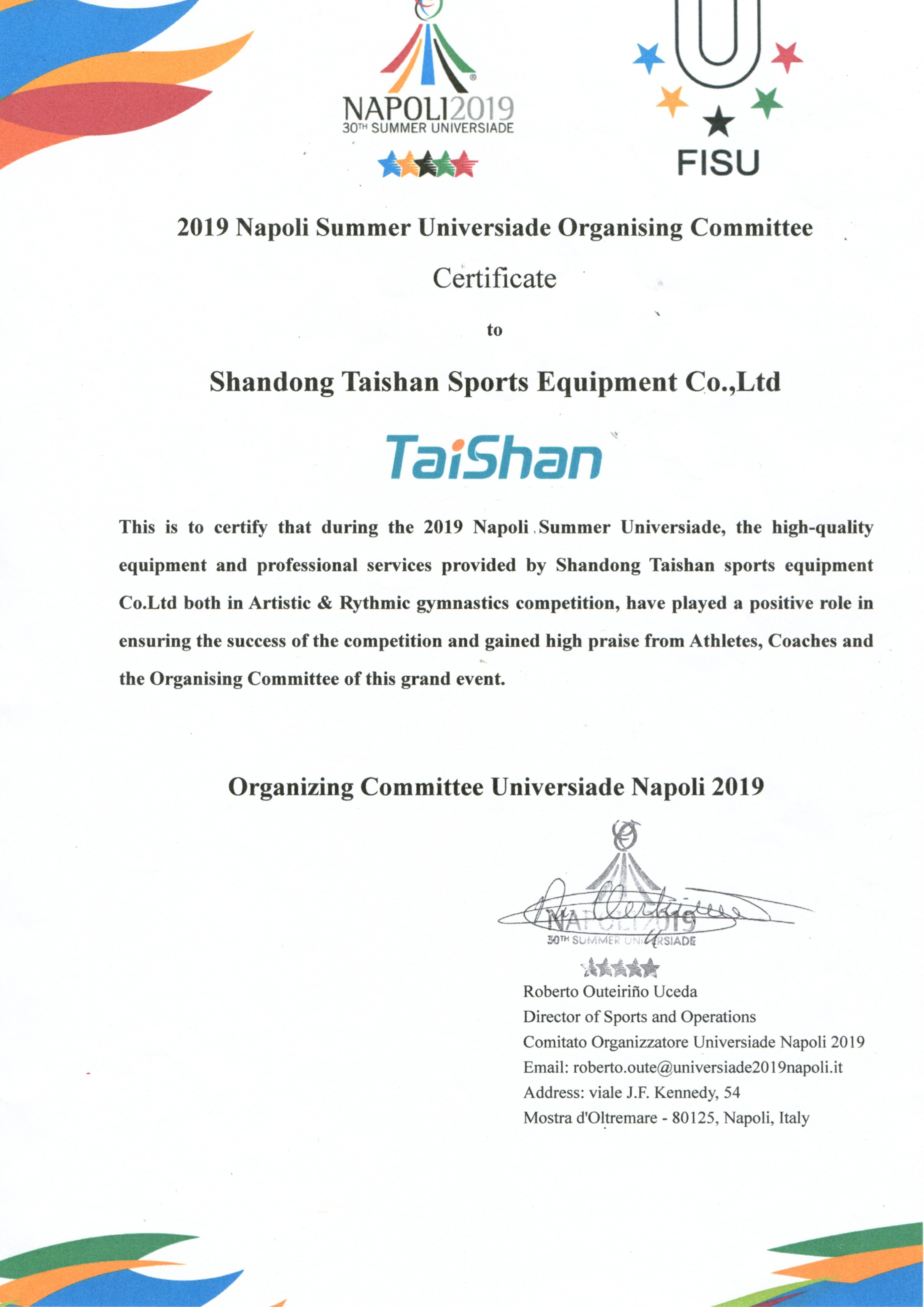 2019年那不勒斯大學(xué)生運(yùn)動會榮譽(yù)證書