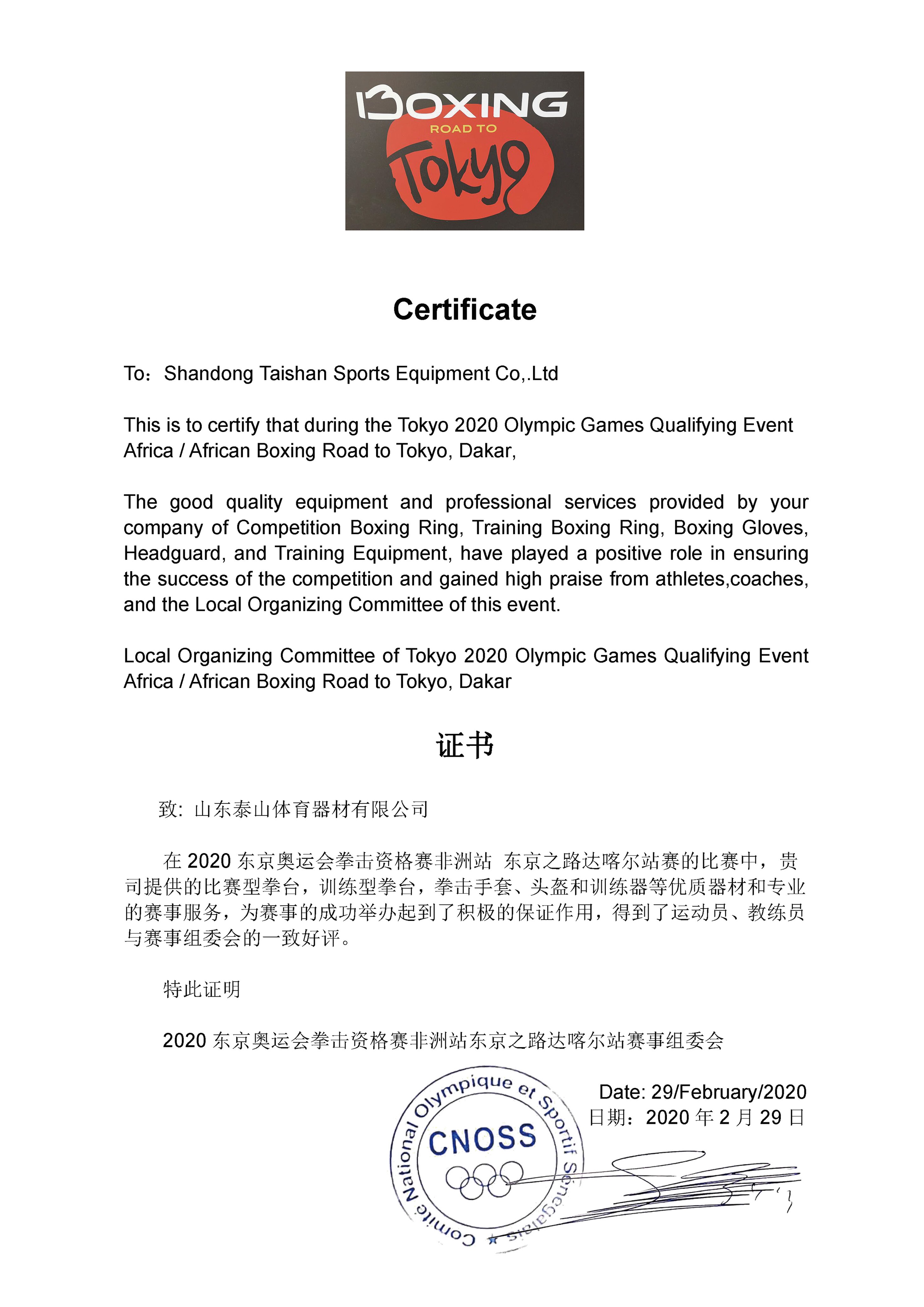 2020年東京奧運(yùn)會拳擊資格賽非洲站證書